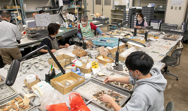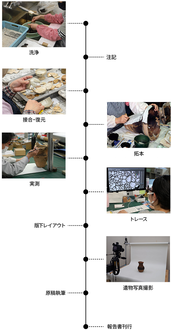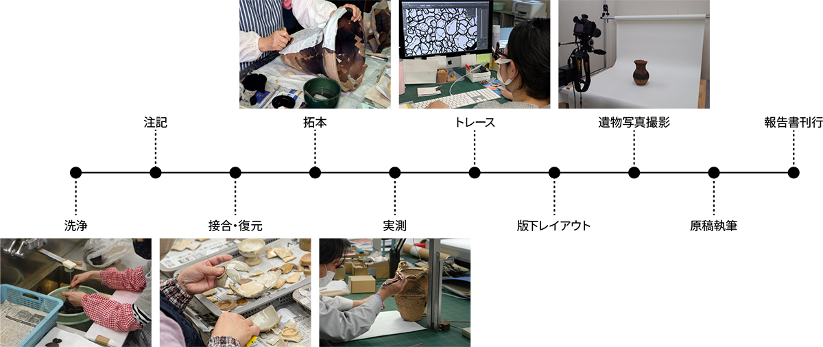 出土遺物は、洗浄・注記・接合等の作業を行い、その後図化等の記録をとります。