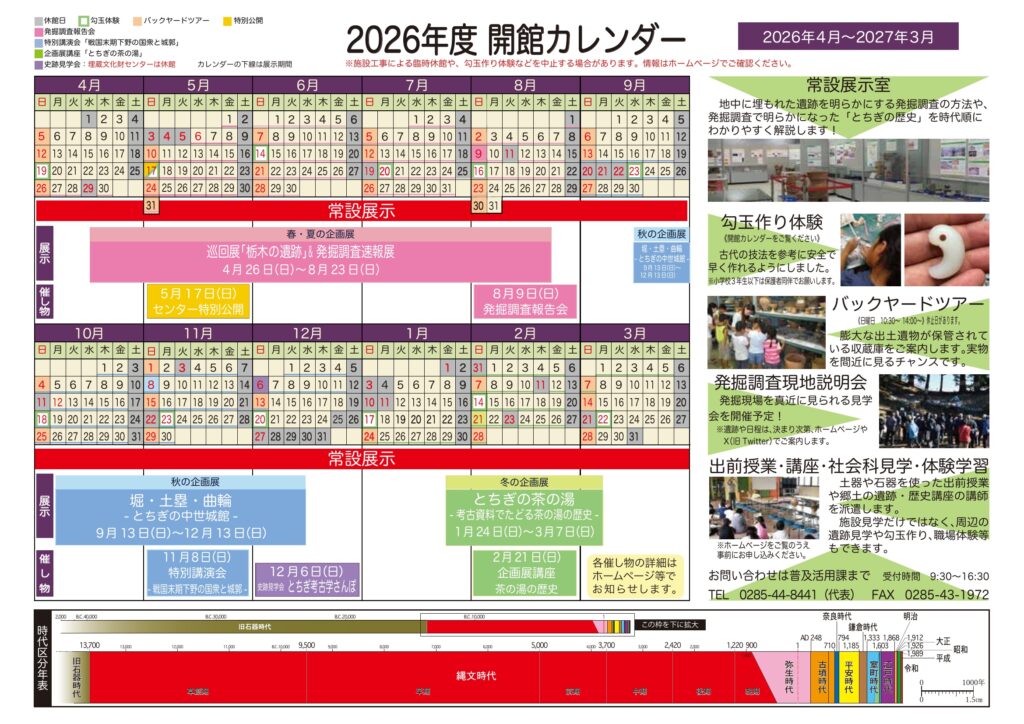 - 2026年 04月 03日令和8年度(2026年度)利用案内および開館カレンダーを公開しました 栃木県埋蔵文化財センターの令和8年度(2026年度)「利用案内」が完成しました。 今年度より、バックヤードツアーや勾玉作り体験の実施方法が一部変更となっています。ご来館前にぜひご確認ください。 ■ 主な掲載内容 2026…