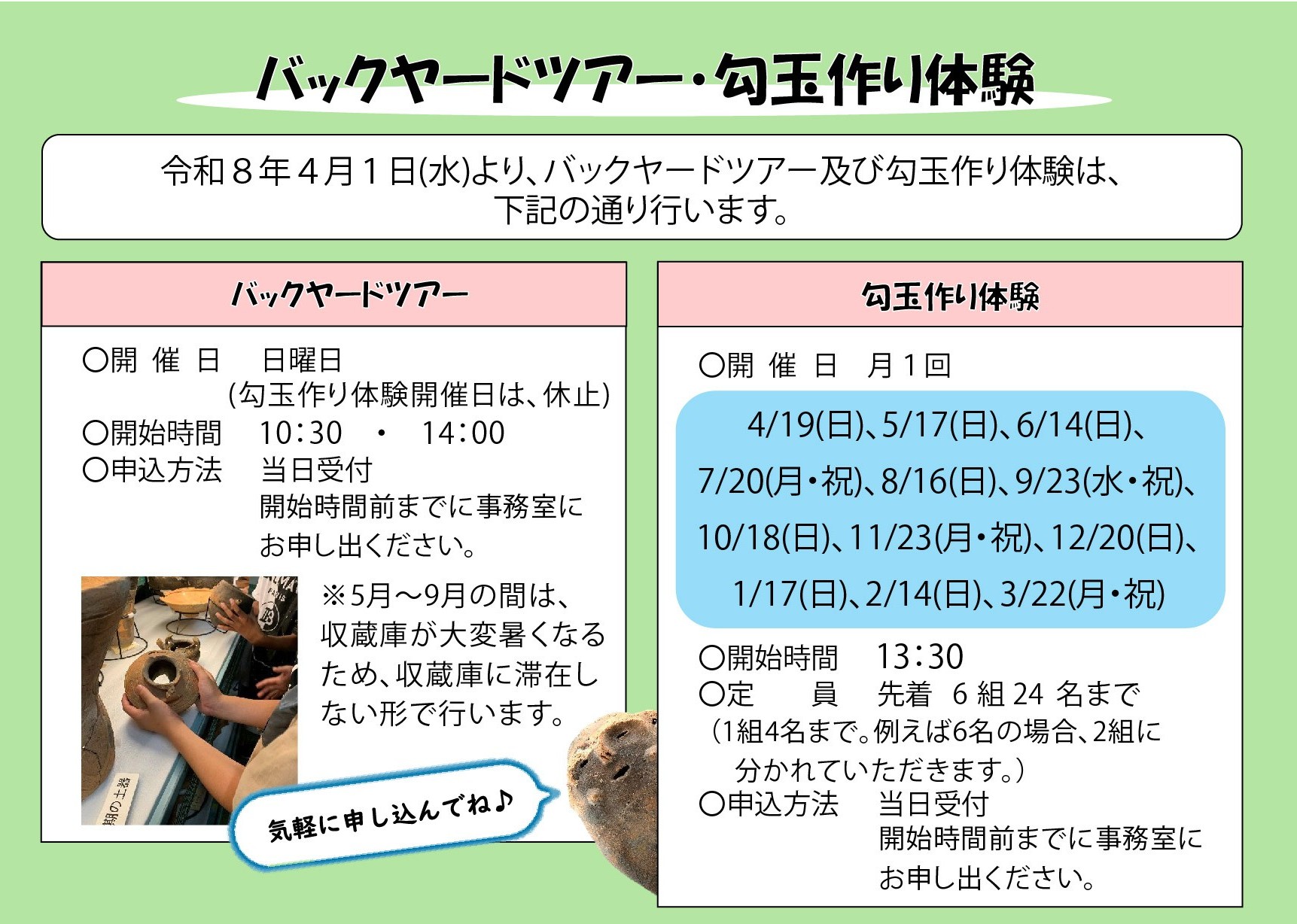 - 2026年 04月 03日【重要】令和8年度からのバックヤードツアー・勾玉作り体験の実施方法変更について 栃木県埋蔵文化財センターでは、令和8年4月1日(水)より、皆さまに、より安全・快適に楽しんでいただくため、普及活用事業の実施方法を以下の通り変更いたします。 ■ 主な変更点 バックヤードツアー: 開催日が日曜日のみ(勾玉…
