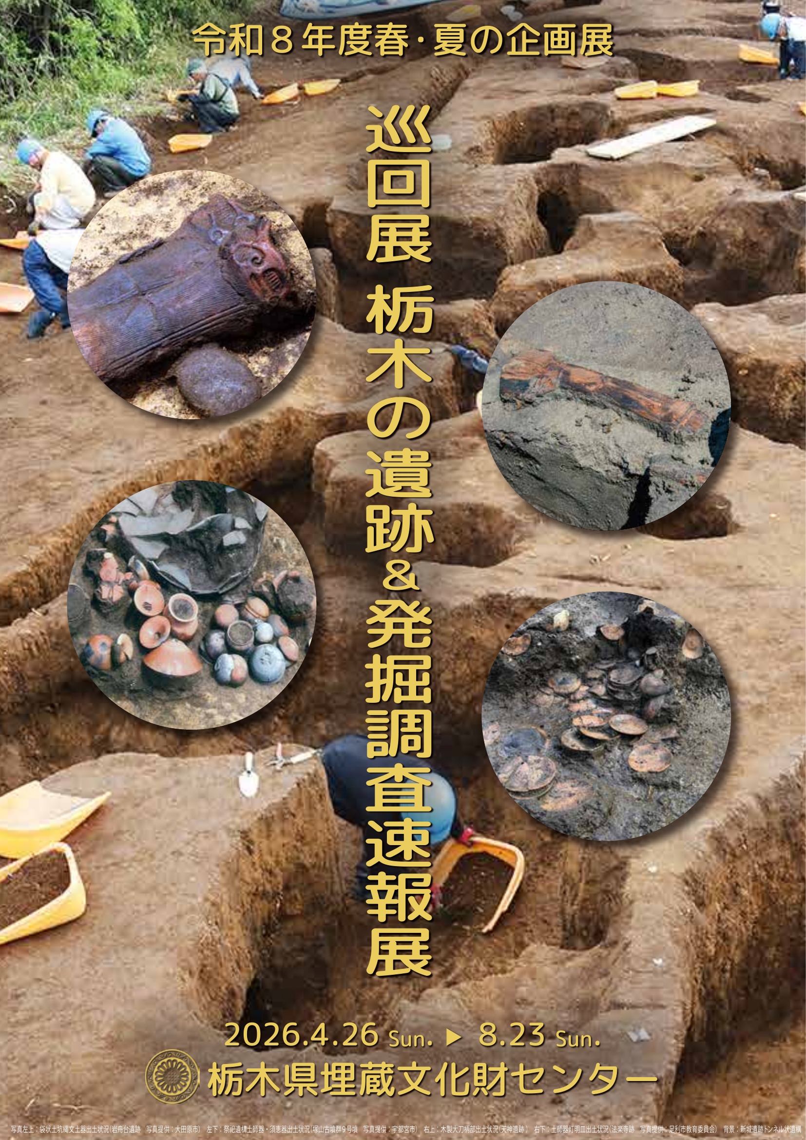 - 2026年 04月 24日春・夏の企画展「巡回展 栃木の遺跡&発掘調査速報展」のお知らせ 栃木県内で近年行われた発掘調査の成果を、出土資料や写真、パネルなどで紹介します。県内各地の遺跡から見えてきた新たな発見を通して、郷土の歴史や文化財の魅力に親しんでいただく企画展です。本展は、より多くの方にご覧いただけるよう、県央・県南・県北…